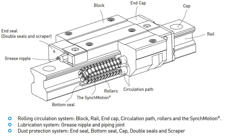 QR series offers super high rigidity and very high load capacities. The QR series with SynchMotion Technology offerslow friction, smooth movement, guieter operation and longer running life. in the industry where high accuracy, lownoise and high rigidity is required, the QR series is interchangeable with the RG series.